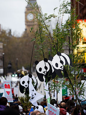To make sure the WWF panda logo could be seen above the sea of 50,000 placards, we created a walking bamboo forest. 5m telescopic poles had real bamboo branches fitted to them with the panda sitting high up amongst its favourite snack.